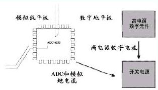 用分離地平板對(duì)于10位ADC的50MSPS和12位ADC的30~35MSPS工作良好。超出此范圍,額外的電路噪聲是明顯的,而且分離的地平板也可引起信號(hào)輻射。當(dāng)線承載電流信號(hào)時(shí),會(huì)在跨越平板間分離處發(fā)生問(wèn)題。