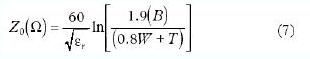 用于帶狀線的特征阻抗計算公式如公式(7)所示。
