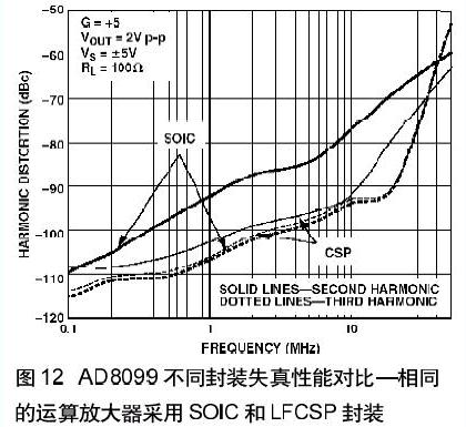 這種引腳排列還有一個好處就是降低了二次諧波失真。傳統(tǒng)運算放大器的引腳配置中引起二次諧波失真的一個原因是同相輸入和負電源引腳之間的耦合作用。LFCSP封裝的低失真引腳排列消除了這種耦合所以極大地降低了二次諧波失真;在有些情況下多可降低14 dB。圖12示出了AD80992 采用SOIC封裝和LFCSP封裝失真性能的差別。