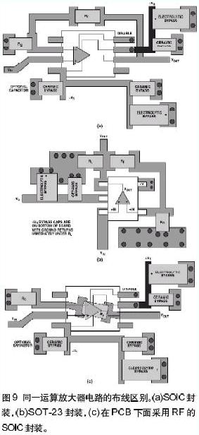 圖9示出了采用SOIC封裝(a)和SOT-23封裝(b)的運算放大器之間的布線區(qū)別。每種封裝都有它自身的一些問題。重點看(a),仔細觀察反饋路徑就發(fā)現(xiàn)有多種方法連接反饋。重要的是保證印制線長度短。反饋路徑中的寄生電感會引起振鈴和過沖。在圖9(a)和9(b)中,環(huán)繞放大器連接反饋路徑。圖9(c)示出了另外一種方法——在SOIC封裝下面連接反饋路徑——這樣就減小了反饋路徑的長度。每種方法都有細微的差別。一種方法會導致印制線過長,會增大串聯(lián)電感。二種方法采用了通孔,會引起寄生電容和寄生電感。在給PCB布線時必須要考慮這些寄生效應的影響及其隱含的問題。SOT-23布線差幾乎是理想的:反饋印制線長度短,而且很少利用通孔;負載和旁路電容從很短的路徑返回到相同的地線連接;正電源端的電容(圖9(b)中未示出)直接放在PCB背面的負電源電容的下面。