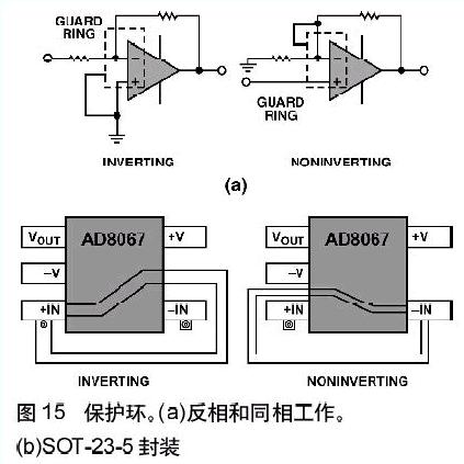 保護環(huán),或者說“隔離環(huán)”,是運算放大器常用的另一種屏蔽方法,它用于防止寄生電流進入敏感結點。其基本原理很簡單——用一條保護導線將敏感結點完全包圍起來,導線保持或者迫使它保持(低阻抗)與敏感結點相同的電勢,因此使吸收的寄生電流遠離了敏感結點。圖15(a)示出了用于運算放大器反相配置和同相配置中的保護環(huán)的原理圖。圖15(b)示出用于SOT-23-5封裝中兩種保護環(huán)的典型布線方法。
