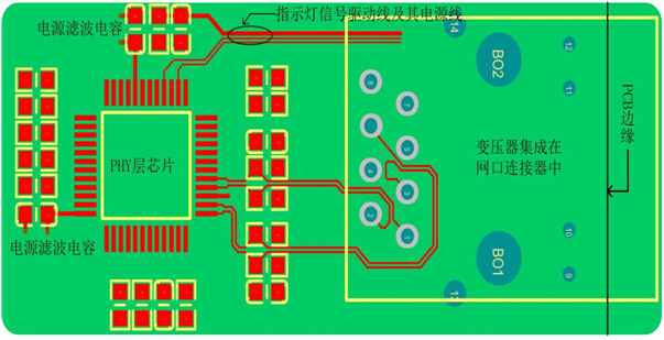 1. 圖 2網口變壓器沒有集成在網口連接器里的參考電路PCB布局、布線圖,下面就以圖 2介紹以太網電路的布局、布線需注意的要點。